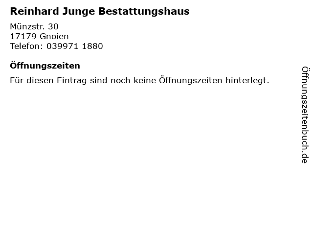 | Öffnungszeiten Reinhard Junge Bestattungshaus in Gnoien anzeigen | |