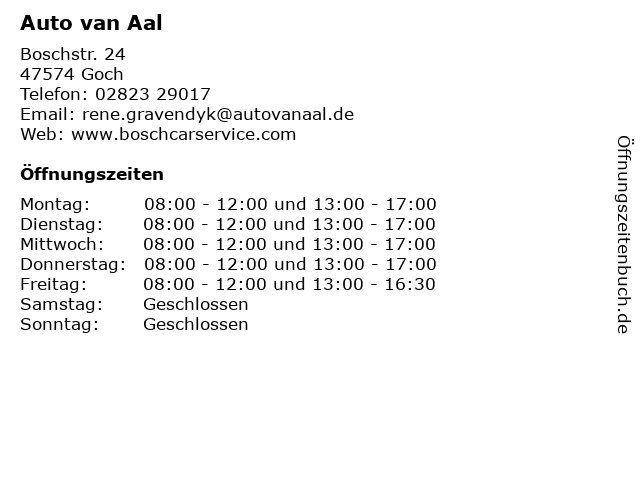 | Öffnungszeiten Auto van Aal in Goch anzeigen | |