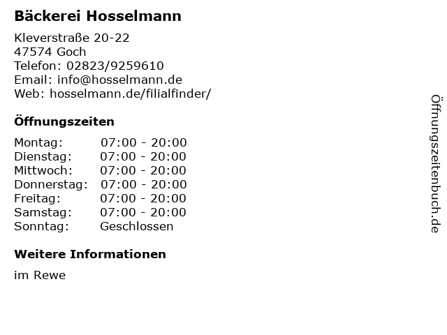 | Öffnungszeiten Bäckerei Hosselmann in Goch anzeigen | |