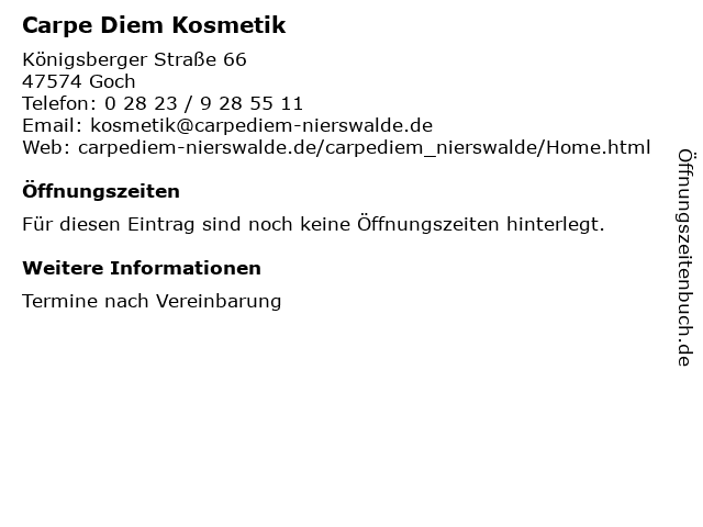 | Öffnungszeiten Carpe Diem Kosmetik in Goch anzeigen | |