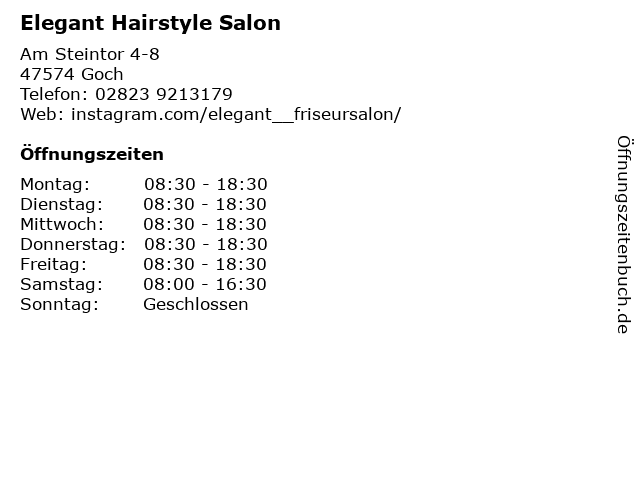 | Öffnungszeiten Elegant Hairstyle Salon in Goch anzeigen | |
