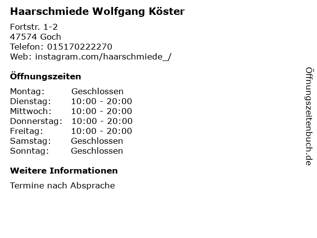 | Öffnungszeiten Haarschmiede Wolfgang Köster in Goch anzeigen | |