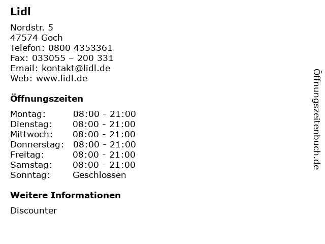 | Öffnungszeiten Lidl in Goch anzeigen | |