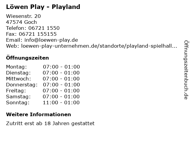 | Öffnungszeiten Löwen Play - Playland in Goch anzeigen | |