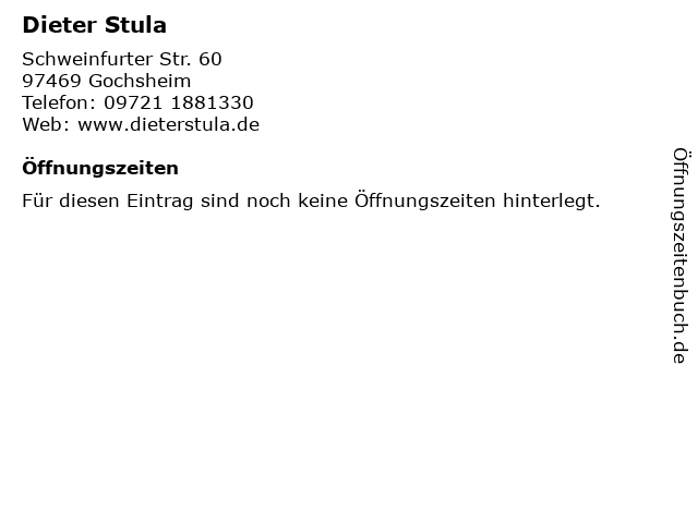 | Öffnungszeiten Dieter Stula in Gochsheim anzeigen | |