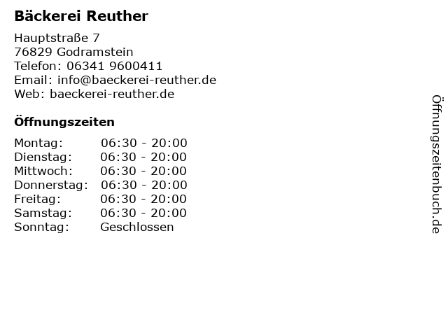 | Öffnungszeiten Bäckerei Reuther in Godramstein anzeigen | |