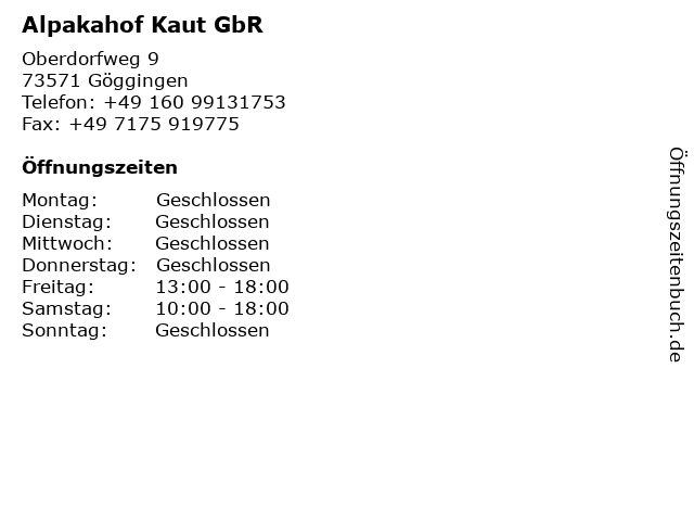 | Öffnungszeiten Alpakahof Kaut GbR in Göggingen anzeigen | |