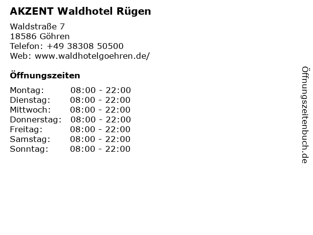 | Öffnungszeiten AKZENT Waldhotel Rügen in Göhren anzeigen | |