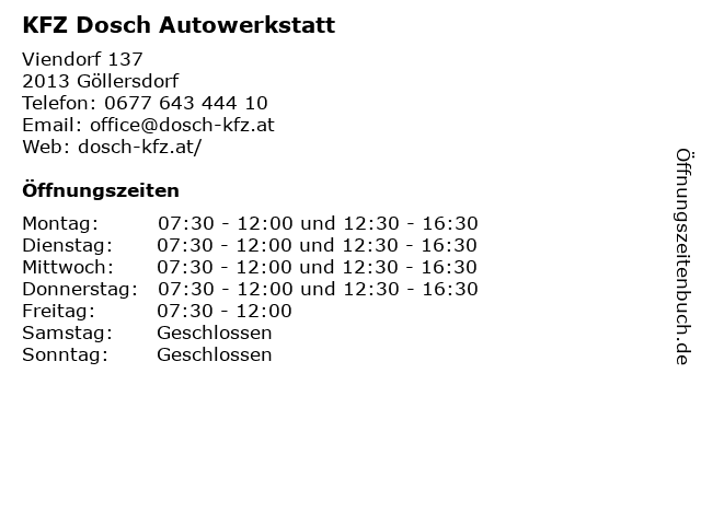 | Öffnungszeiten KFZ Dosch Autowerkstatt in Göllersdorf anzeigen | |