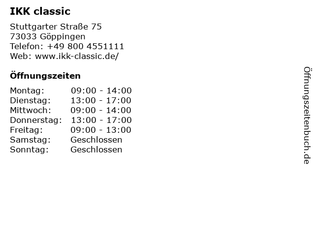 | Öffnungszeiten IKK classic in Göppingen anzeigen | |