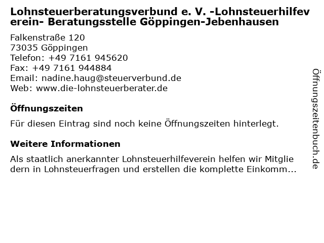 | Lohnsteuerberatungsverbund e. V. -Lohnsteuerhilfeverein- Beratungsstelle Göppingen-Jebenhausen anrufen | |