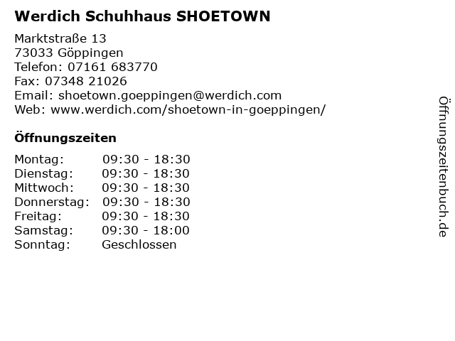 | Öffnungszeiten Werdich Schuhhaus SHOETOWN in Göppingen anzeigen | |
