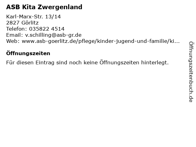| Öffnungszeiten ASB Kita Zwergenland in Görlitz anzeigen | |