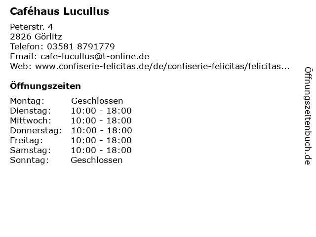 | Öffnungszeiten Caféhaus Lucullus in Görlitz anzeigen | |