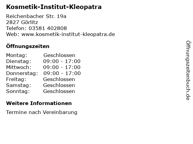 | Öffnungszeiten Kosmetik-Institut-Kleopatra in Görlitz anzeigen | |