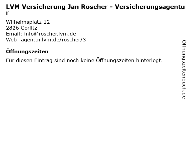 | Öffnungszeiten LVM Versicherung Jan Roscher - Versicherungsagentur in Görlitz anzeigen | |