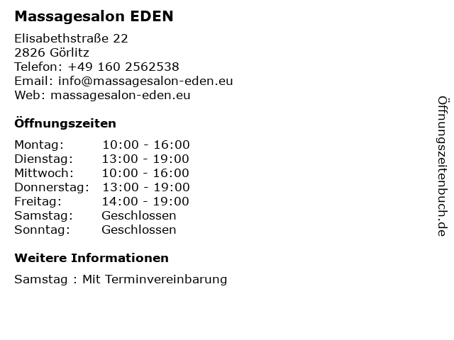 | Öffnungszeiten Massagesalon EDEN in Görlitz anzeigen | |