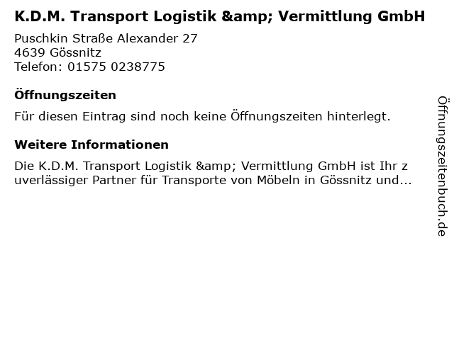 | K.D.M. Transport Logistik & Vermittlung GmbH anrufen | |