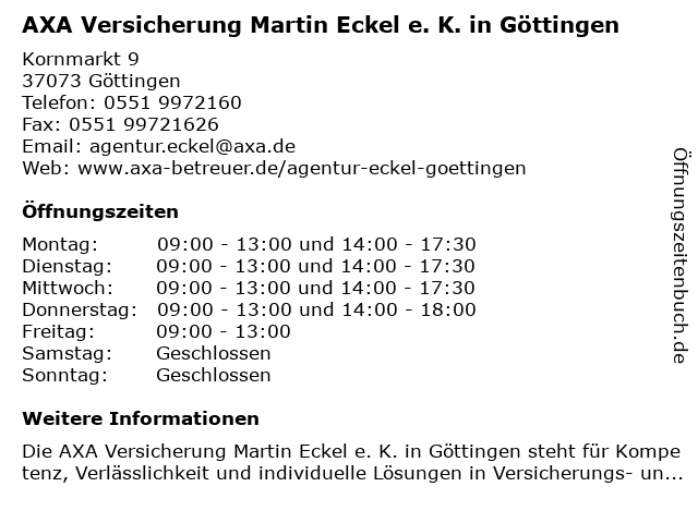 1 DBV Deutsche Beamtenversicherung Martin Eckel e. K in Göttingen (Entfernung: 0,01 km) Kornmarkt 9, 37073 Göttingen 3 AXA Versicherung - Hauptvertretung Markus Hoffmann (Entfernung: 1,56 km) Arndt Str. 6, 37075 Göttingen 5 6 Versicherungsbüro Michael Schmidt - Göttingen (Entfernung: 3,78 km) Karl-grüneklee-straße 22, 37077 Göttingen |