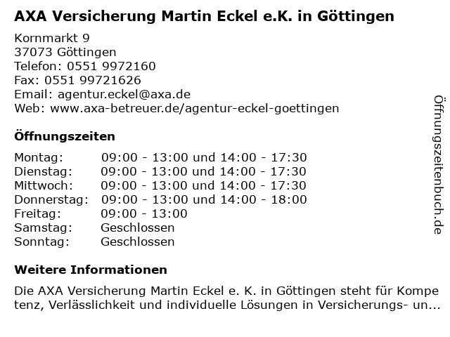 1 DBV Deutsche Beamtenversicherung Martin Eckel e.K. in Göttingen (Entfernung: 0,01 km) Kornmarkt 9, 37073 Göttingen 3 AXA Versicherung - Hauptvertretung Markus Hoffmann (Entfernung: 1,56 km) Arndt Str. 6, 37075 Göttingen 5 6 Versicherungsbüro Michael Schmidt - Göttingen (Entfernung: 3,78 km) Karl-grüneklee-straße 22, 37077 Göttingen |