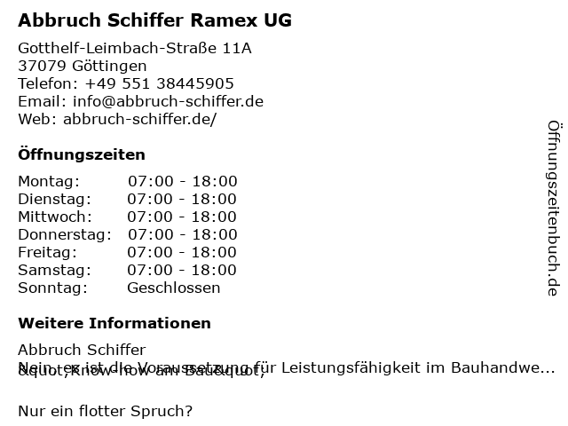 | Öffnungszeiten Abbruch Schiffer Ramex UG in Göttingen anzeigen | |
