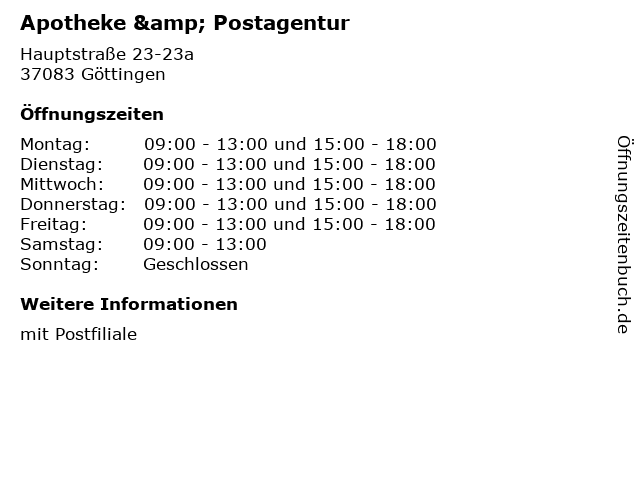 | Öffnungszeiten Apotheke & Postagentur in Göttingen anzeigen | |