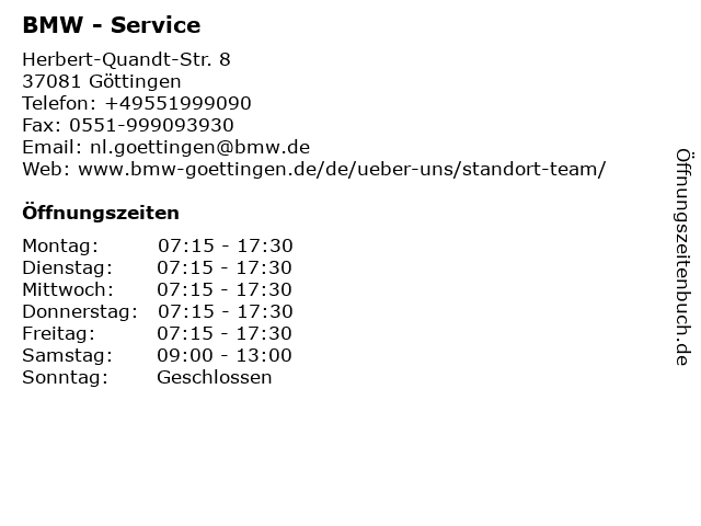 | Öffnungszeiten BMW - Service in Göttingen anzeigen | |