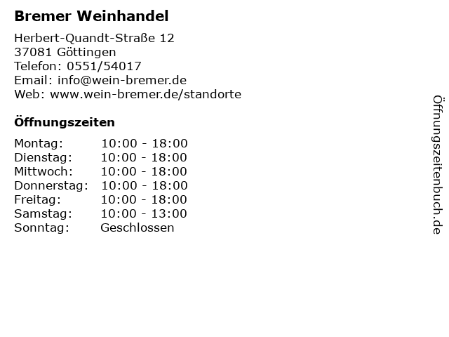 | Öffnungszeiten Bremer Weinhandel in Göttingen anzeigen | |
