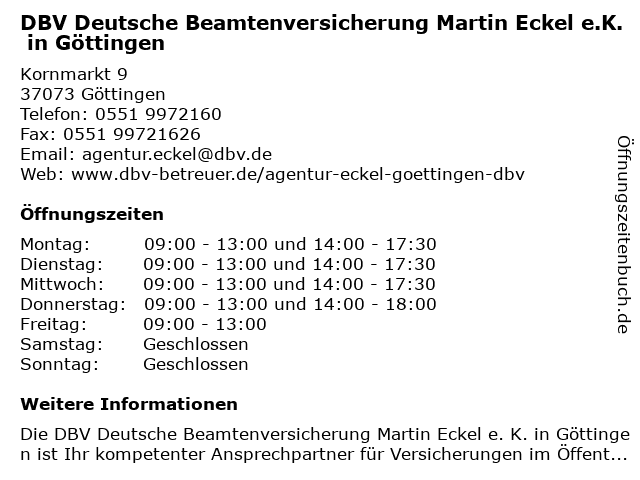 3 DBV Deutsche Beamtenversicherung Benjamin Strahlke in Göttingen (Entfernung: 2,46 km) Stadtstieg 5a, 37083 Göttingen 4 5 DBV-Winterthur Schieferstein Hans-Heinrich Bezirksleiter (Entfernung: 36,41 km) Im Rothenbach 51, 37290 Meißner 6 DBV-Wintherthur Versicherungen Stadtbüro Versicherung (Entfernung: 36,60 km) Hannoversche Str. 6 A, 34266 Niestetal |