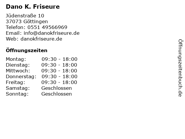 | Öffnungszeiten Dano K. Friseure in Göttingen anzeigen | |