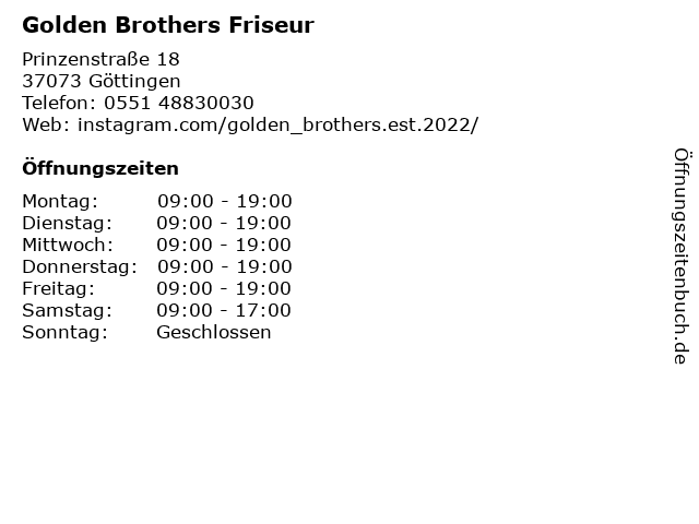 | Öffnungszeiten Golden Brothers Friseur in Göttingen anzeigen | |