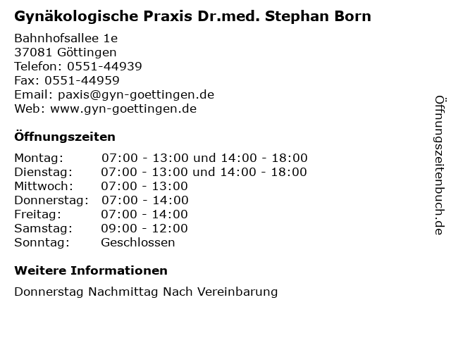 4 Praxis für Koloproktologie und chirurgische Endoskopie Göttingen PD Dr. med. Stephan Samel Dr. med. Michael Mügge (Entfernung: 1,64 km) Waldweg 1, 37073 Göttingen 6 Kanzlei Dr. Stephan Kleinjohann, Dr. Dietmar Buschhaus, Dr. Marc Matthias Kohl und Dr. Jörg Rösing (Entfernung: 2,56 km) Götzenbreite 1, 37124 Rosdorf |