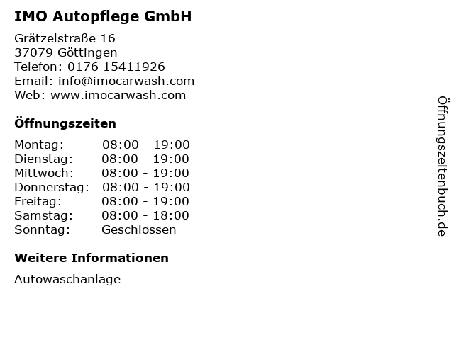 | Öffnungszeiten IMO Autopflege GmbH in Göttingen anzeigen | |