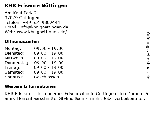 | Öffnungszeiten KHR Friseure Göttingen in Göttingen anzeigen | |