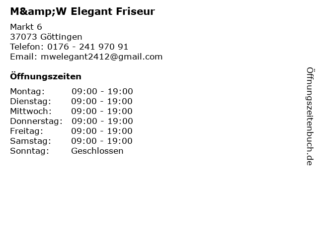 | Öffnungszeiten M&W Elegant Friseur in Göttingen anzeigen | |