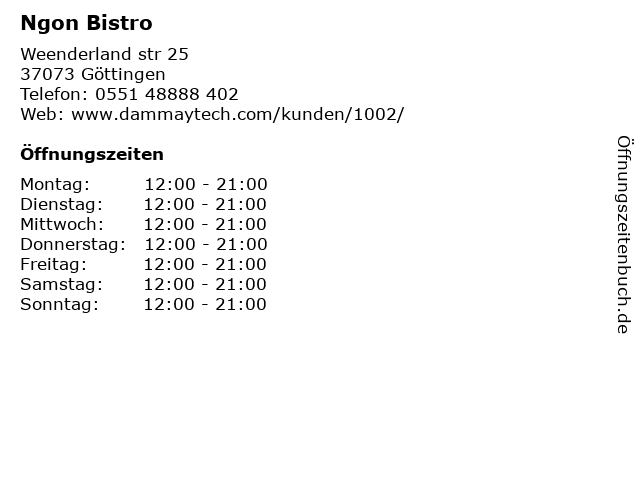 | Öffnungszeiten Ngon Bistro in Göttingen anzeigen | |