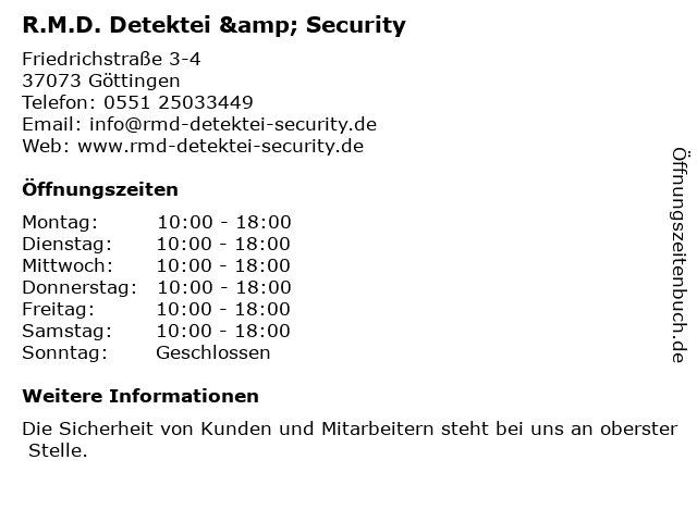| Öffnungszeiten R.M.D. Detektei & Security in Göttingen anzeigen | |