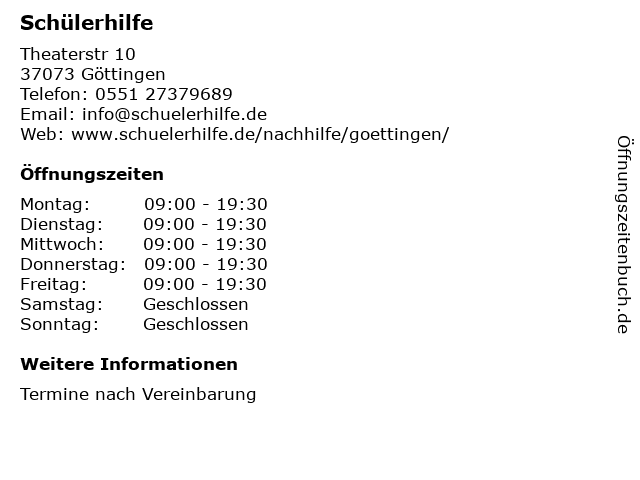 | Öffnungszeiten Schülerhilfe in Göttingen anzeigen | |