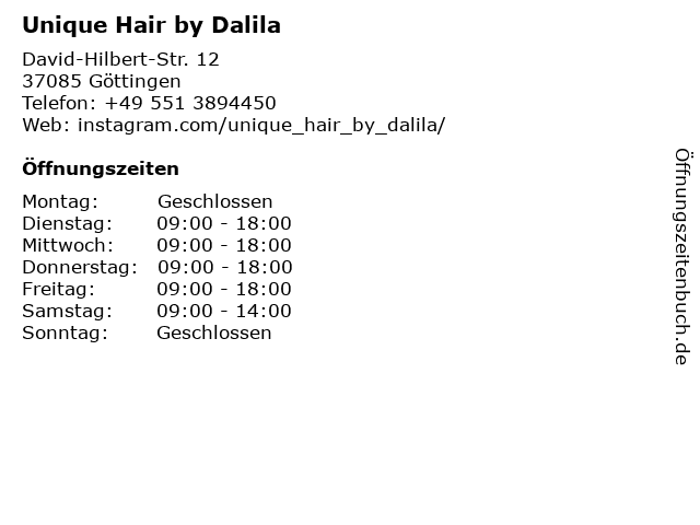 | Öffnungszeiten Unique Hair by Dalila in Göttingen anzeigen | |