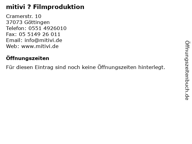 | Öffnungszeiten mitivi ? Filmproduktion in Göttingen anzeigen | |