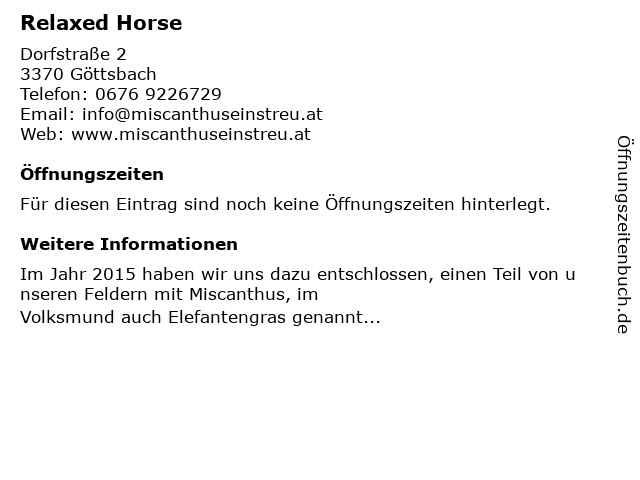 | Öffnungszeiten Relaxed Horse in Göttsbach anzeigen | |