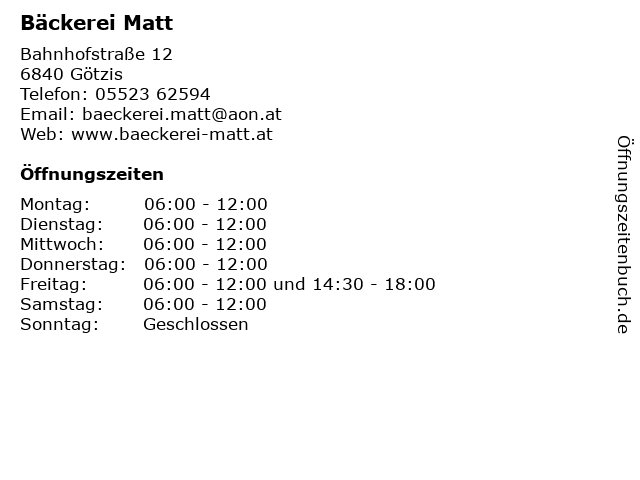 | Öffnungszeiten Bäckerei Matt in Götzis anzeigen | |