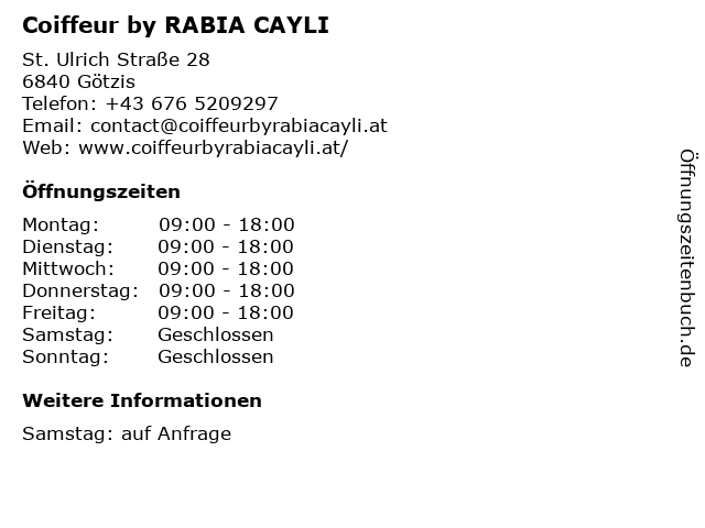 | Öffnungszeiten Coiffeur by RABIA CAYLI in Götzis anzeigen | |