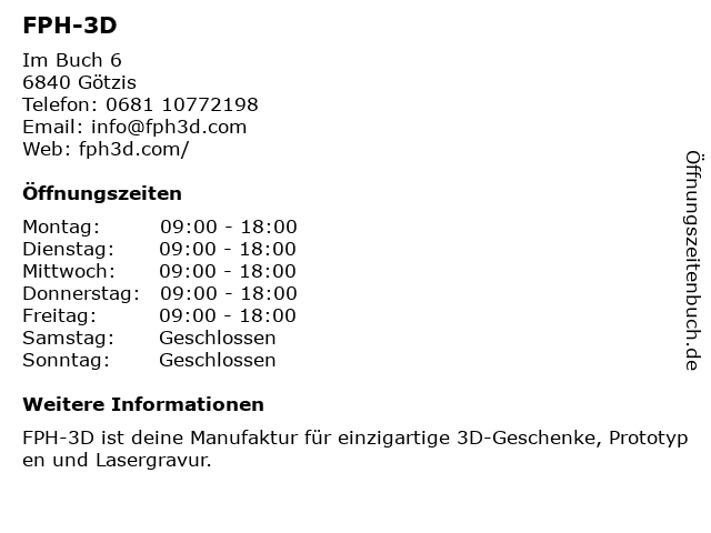 | Öffnungszeiten FPH-3D in Götzis anzeigen | |