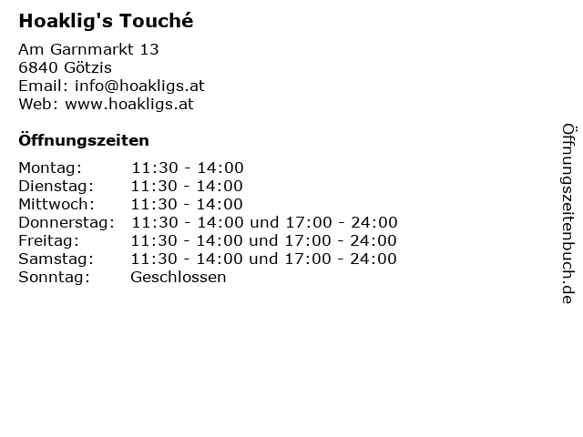 | Öffnungszeiten Hoaklig's Touché in Götzis anzeigen | |
