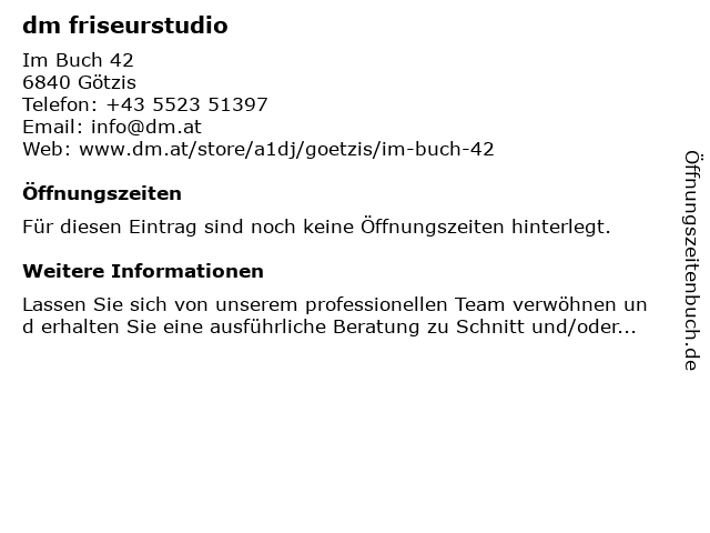 | Öffnungszeiten dm friseurstudio in Götzis anzeigen | |