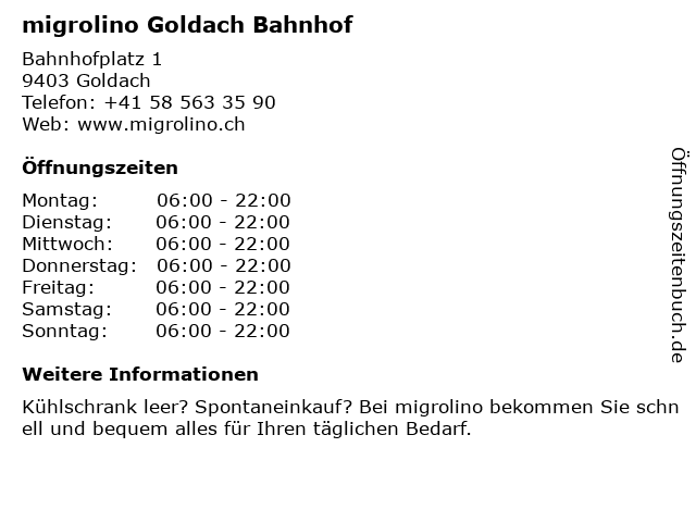 | Öffnungszeiten migrolino Goldach Bahnhof in Goldach anzeigen | |