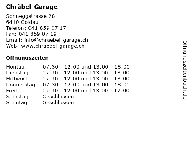 | Öffnungszeiten Chräbel-Garage in Goldau anzeigen | |