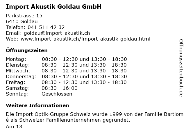 | Öffnungszeiten Import Akustik Goldau GmbH in Goldau anzeigen | |