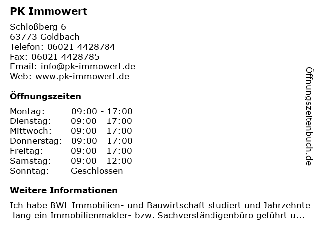 | Öffnungszeiten PK Immowert in Goldbach anzeigen | |